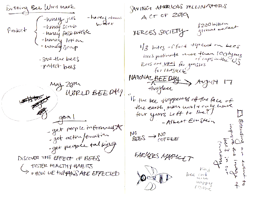 I created a hand painted work-mark of the animal, bee. From there I went into Illustrator to make a more visually descriptive mark, testing multiple strategies of communicating. The final word-mark emulated buzzing, flight and striped through repetition, composition and negative space lined letter forms.